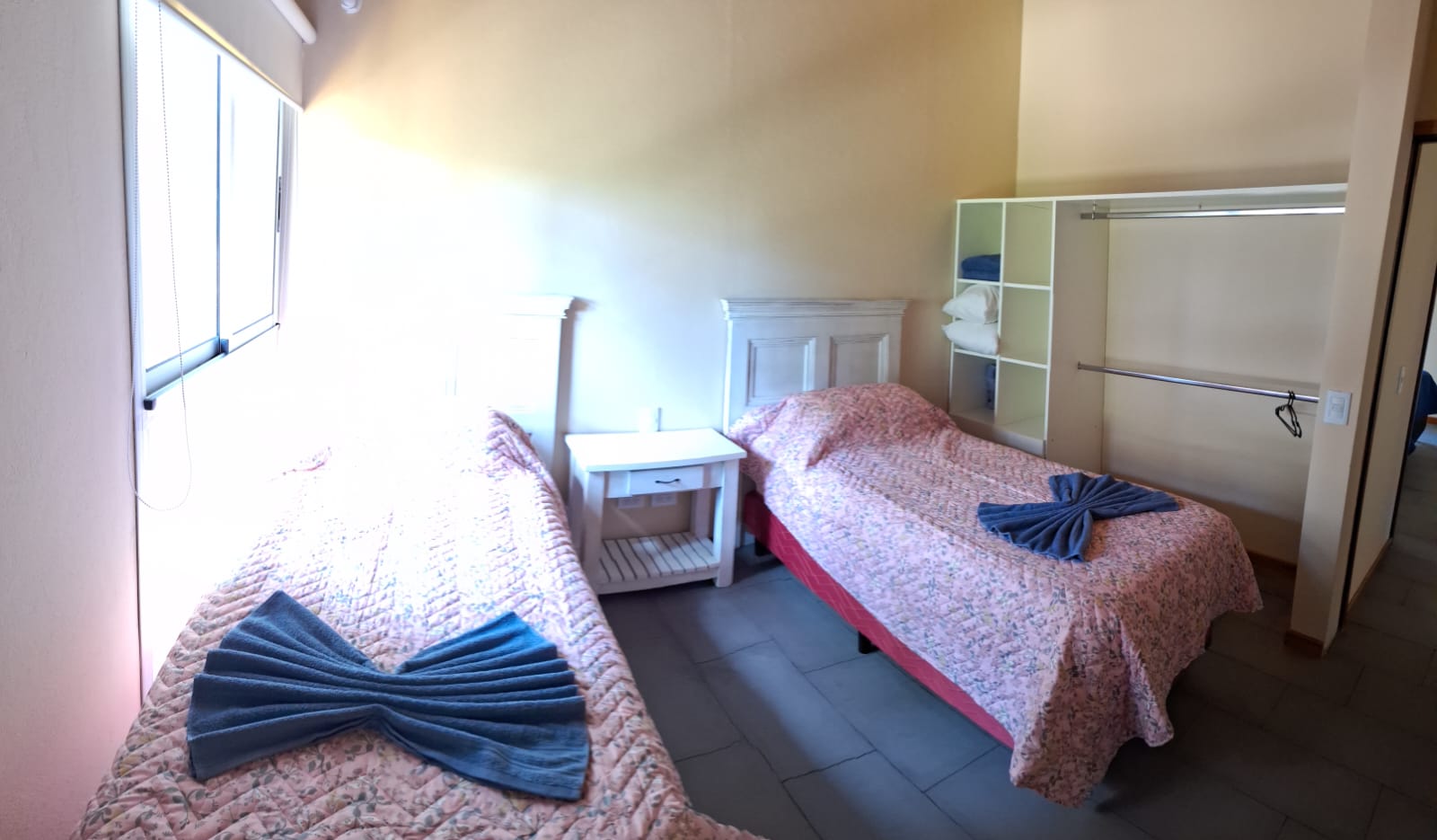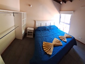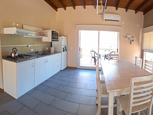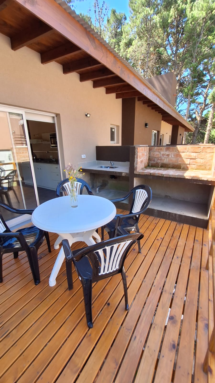 Capacidad para 6 personas. Consta de 2 habitaciones. Living y cocina-comedor. 2 baños, 1 en suit. Aire Acondicionado Frío-calor en habitación matrimonial y living. Deck privado con parrilla. Servicio de TV con cable y WiFi individual por fibra óptica. Todas las cabañas tienen alarma individual.