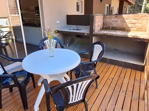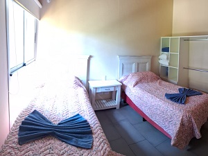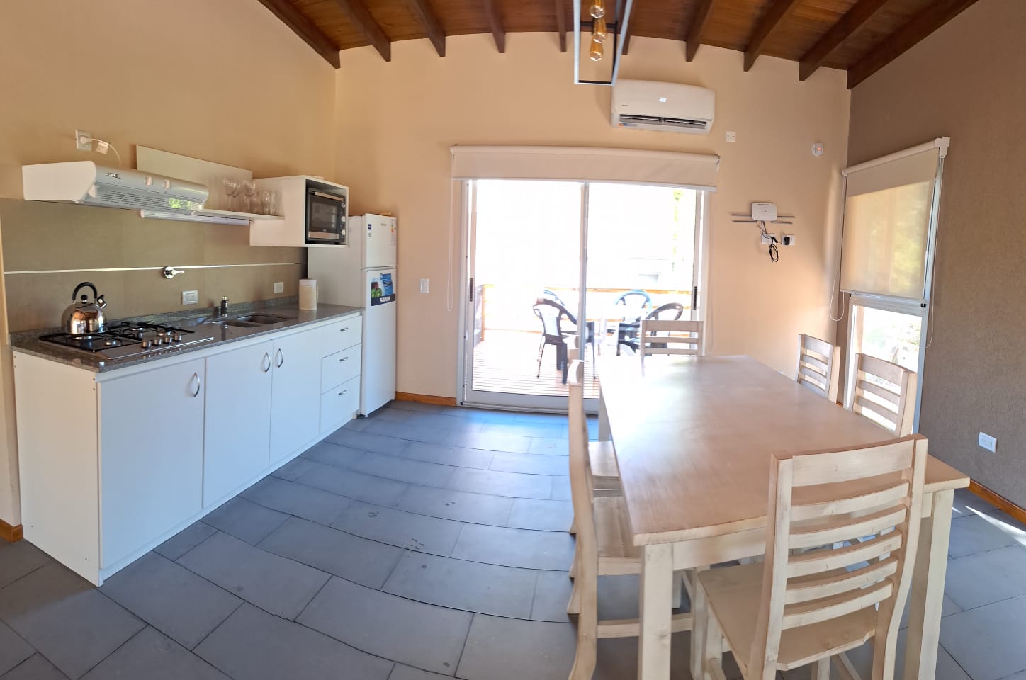 Capacidad para 6 personas. Consta de 2 habitaciones. Living y cocina-comedor. 2 baños, 1 en suit. Aire Acondicionado Frío-calor en habitación matrimonial y living. Deck privado con parrilla. Servicio de TV con cable y WiFi individual por fibra óptica. Todas las cabañas tienen alarma individual.